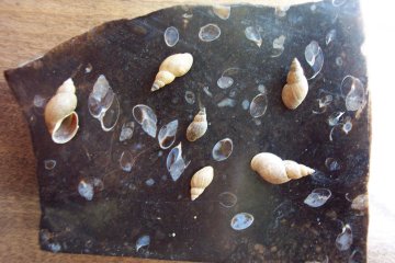 We got the fossil of these snails from Rene's Rock and Fossil Shop in British Columbia, Canada. The shops proprietor said these snails were 65 million years old. Back home in our ditch we have the same snails and they are living.