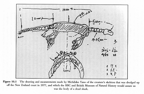 It is thought provoking to consider that the Japanese have no problem with officially owning up to the present-day existence of dragons, sea-monsters or dinosaurs. Indeed, they even issued a postage-stamp with a picture of a pleisiosaurus to commemorate the above find. Only we in the West seem to have a problem with the present-day existence of these creatures, for only nine days after the appearance of the Times article, it was somberly announced on the 30th July 1977 by the BBC that the monster only looked like a pleisiosaurus. It in fact was a shark that had decomposed in such a way as to convey the impression that it had a long neck, a small head and four large paddles. How they, or their informants at the Natural History Museum in Kensington, could tell this since the creature was no longer available for examination, we can only guess at, especially considering that the marine biologist on board the vessel, the Zuiyo-maru, had sketched the creatures skeletal structure and it is nothing like that of a shark (see Figure 10.1). Marine biologists are highly trained scientists whose ability to detect disease and mutations in fish and marine mammals is crucial to the health of the consumer let alone the profits of the fishing vessel concerned, so their knowledge of marine life is necessarily very great. Yet the BBC would have us believe that Michihiko Yano, the government-trained and highly qualified marine biologist who examined, photographed and measured the monster, wouldn't know a dead shark when he saw one!