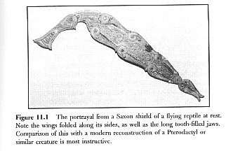 The last monster to be destroyed by Beowulf (and from which encounter Beowulf also died in the year AD 583) was a flying reptile which lived on a promontory overlooking the sea at Hronesness on the southern coast of Sweden. Now, the Saxons (and presumably the Danes) knew flying reptiles in general as lyftfloga (air-fliers), but this particular species of flying reptile, the specimen from Hronesness, was known to them as a widfloga, lit, a wide (or far-ranging) flyer, and the description that they have left us fits that of a giant Pteranodon. Interestingly, the Saxons also described this creature as a ligdraca, or fire-dragon, and he is described as fifty feet in length (or perhaps wing-span?) and about 300 years of age. (Great age is a common feature even among today's non-giant reptiles.) Moreover, and of particular interest to us, the name widfloga would have distinguished this particular species of flying reptile from another similar species which was capable of making only short flights. Such a creature is portrayed in Figure 11.1, a shield-boss from the Sutton Hoo burial which shows a flying dragon with its wings folded along its sides. Its long tooth-filled jaws are readily seen, and the shield-boss can be seen to this day in its showcase at the British Museum. Modern paleontologists, working from fossilized remains, have named such a creature Pterodactyl.
