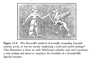 But is Beowulf's method of slaying Grendel unknown elsewhere in the historical record? Are there no depictions to be found of similar creatures being killed in a similar way? It would seem that there are, the illustration below being one example (see Figure 11.2). It is taken from an impression of an early Babylonian cylinder seal now in the British Museum, and clearly shows a man about to amputate the forelimb of a bipedal monster whose appearance, though stylistic, fits the descriptions of Grendel very closely. I know of no scholar who would venture to suggest that the Old English author of Beowulf filched his idea from his knowledge of Babylonian cylinder seals. So we may, I think, safely assume that Beowulf's method of slaying this particular kind of animal was not entirely unknown in the ancient world. Nor, indeed, was the Grendel itself entirely unknown in the ancient world, as is evident from the following item depicted in Figure 11.3.
