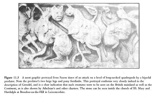 Now it cannot be pretended that these are merely caricatures of ordinary animals that are indigenous (these days) to the British Isles, for none of our present native species have long necks or are bipedal. So how are we to satisfactorily account for them? Is there a predatory animal from the fossil record known to us, who had two massive hindlegs and two comparatively puny forelimbs? There is indeed. In fact there are several such species, but how was our Saxon artist to know about such creatures if he'd never seen one? Are we looking here at a depiction in stone of the creature known to the Saxons and Danes as Grendel? Considering the close physical descriptions that we find in Beowulf, it would seem that we are.