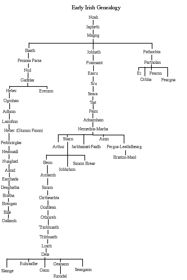 'As the Milesians were the last of the ancient colonists ... only their genealogies, with a few exceptions, have been preserved. The genealogical tree begins, therefore, with the brothers Eber and Eremon, the two surviving leaders of the expedition, whose ancestors are traced back to Magog, the son of Japhet. The great southern chieftains, such as the MacCarthys and O'Briens, claim descent from Eber; the northern families of O'Connor, O'Donnell, and O'Neill, claim Eremon as their head. There are also other families claiming descent from Emer, the son of Ir, brother to Eber and Eremon; as also from their cousin Lugaidh, the son of Ith. From these four sources the principle Celtic families of Ireland have sprung...' (25)