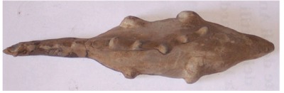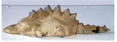 The plates are triangular, and continue along the back until reaching the tail. The view from above the object reveals a strange curving of the plates, as if the animal had been represented in motion on the land...