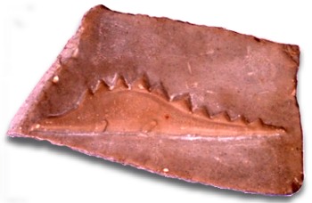 A Piece of 'ancient" pottery found with an image of a stegosaurus. Click and drag photo to resize.